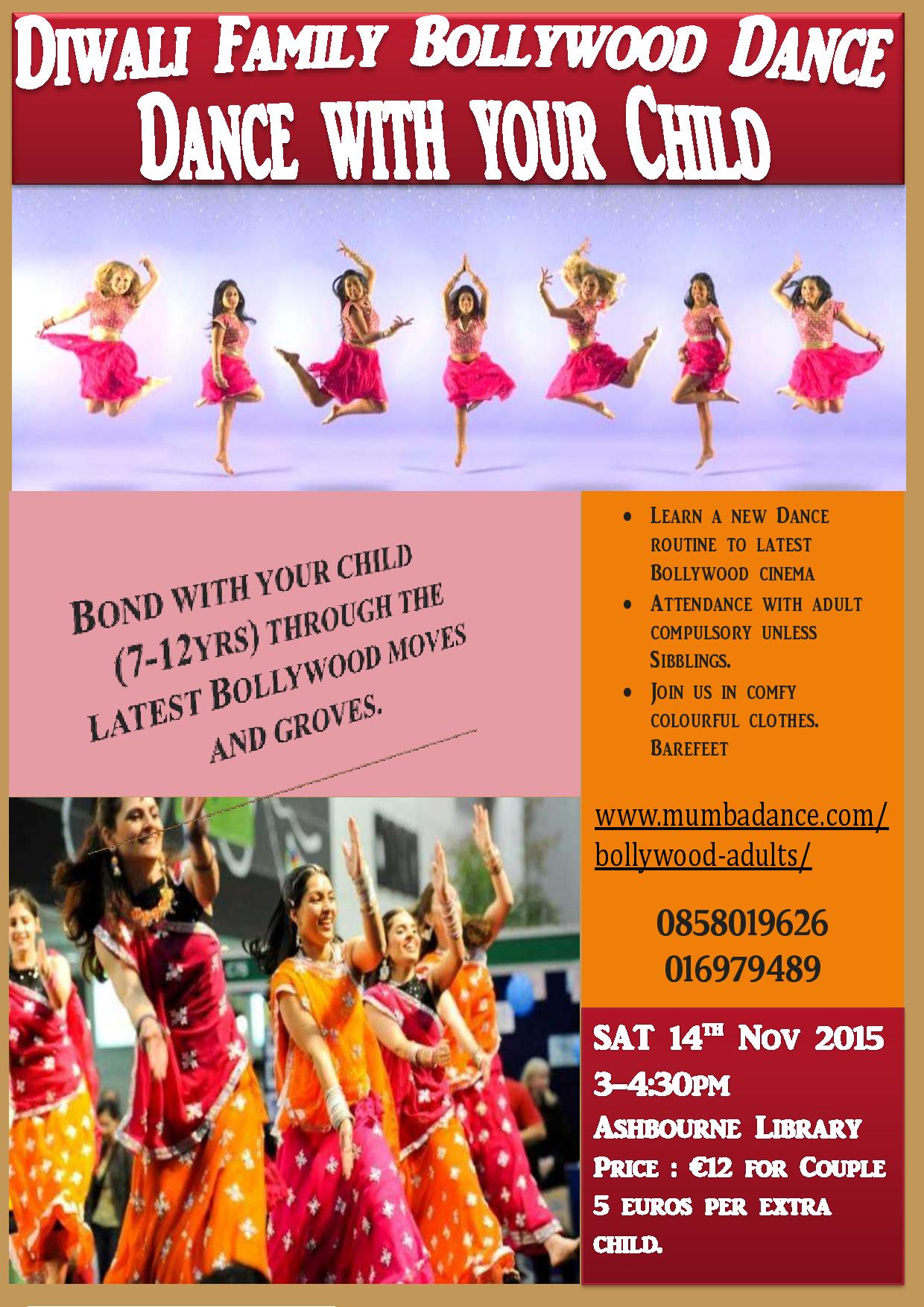 Diwali the Indian Festival of lights is being celebrated this year on the 11th November 2015. Ashbourne Library is presenting a Bollywood Workshop for Adults with their Kids. Dance together. Learn about a novel form of dance and about a ~New cultural experience together. The Workshop is designed for adults to partner their kids and create a Bollywood energetic dance routine. It will be perfect entertainment for this Christmas family Dinner. Dress comfortably, barefeet, Water and we'll bring the Bindis.