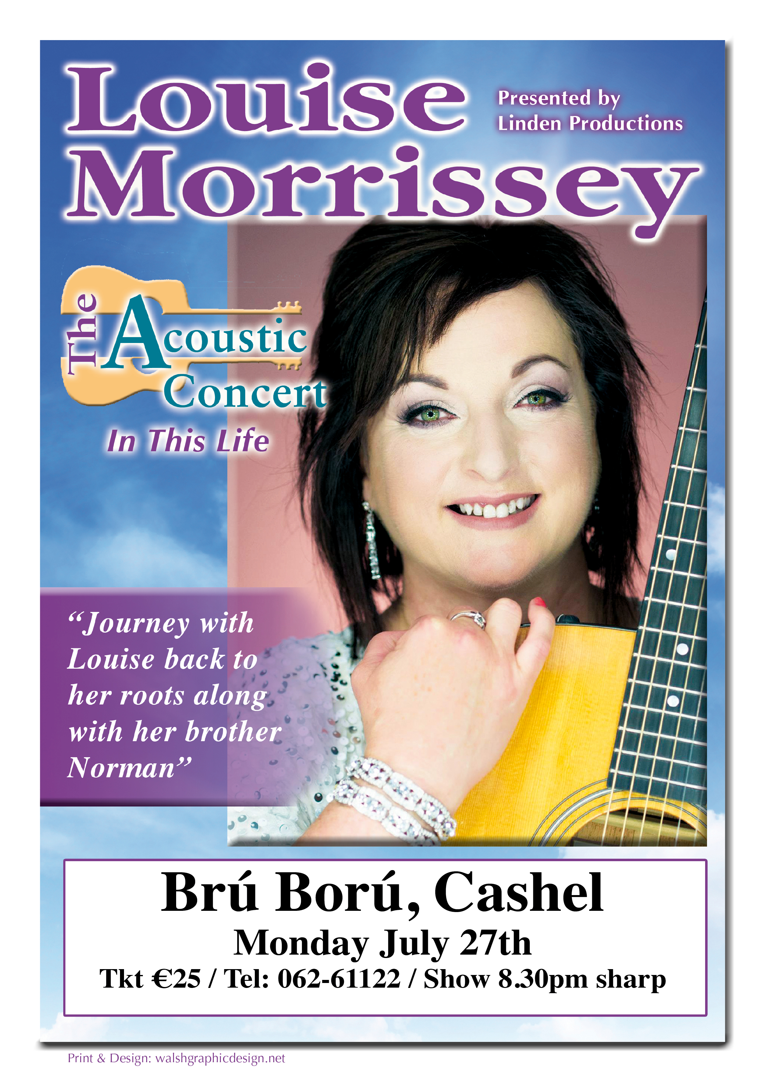 Louise Morrissey has long been regarded as one of Ireland's greatest interpreters of song. In this acoustic concert Louise will journey back in time and recall many memories from her many successful years with the highly acclaimed Folk Group The Morrisseys up to her present day repertoire. Joining Louise on the night on bass and vocals will be her brother Norman and together they will entertain in this special concert and journey back in time and re live with their audience her many hits including the chart topping "Old Rustic Bridge by the Mill" and "Come Back Paddy Reilly to Ballyjamesduff" to mention but a few. Tickets for this lovely evening available from Bru Ború box office 062 61122. Tickets €25 . Show 8.30pm