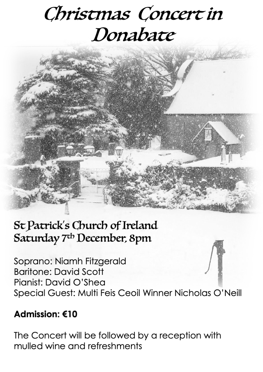 St Patrick's Church of Ireland (Donabate) is hosting a night of beautiful Christmas music and carols. Featuring baritone David Scott, soprano Niamh Fitzgerald, pianist David O'Shea and multi feis ceoil winner Nicholas O'Neill. The concert will be followed by a mulled wine reception