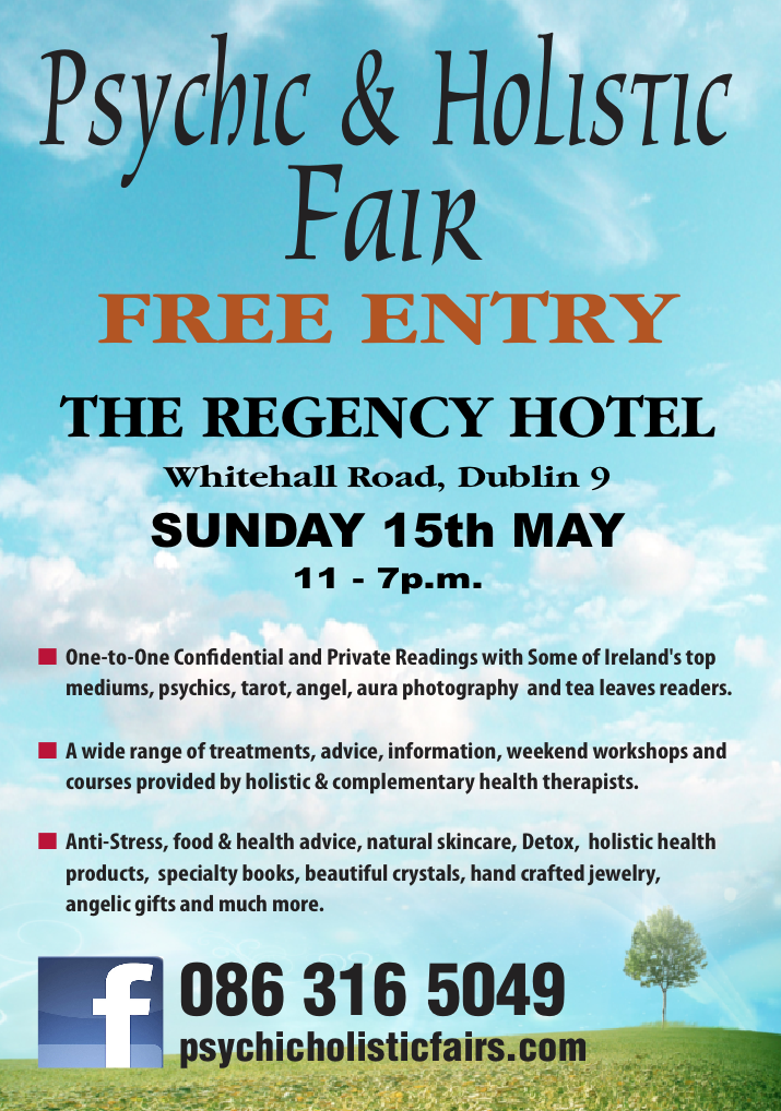 Free Entry to the Psychic & Holistic Fair at the The Regency Hotel, Swords Rd, Dublin 9 Sunday 15th May - 11 am to 7 pm. Over 40 stands showcasing,