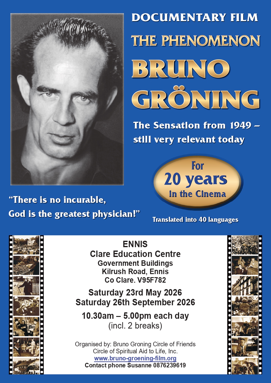 The film, "The Phenomenon Bruno Groening - In the footsteps of the miracle healer", shows the events surrounding Bruno Groening. In autumn of 1949, close to 30,000 people were drawn to the Traberhof in Rosenheim daily. Newspapers, radio and television reported: "It is beyond reason. Bruno Groening heals the crippled, the blind, the deaf..."