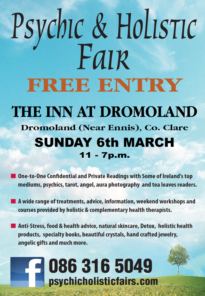 Free Entry to the Psychic & Holistic Fair at the The Inn at Dromoland, New Market on Fergus (Just outside Ennis), Co. Clare on the 6th March - 11 am to 7 pm. Over 35 stands showcasing