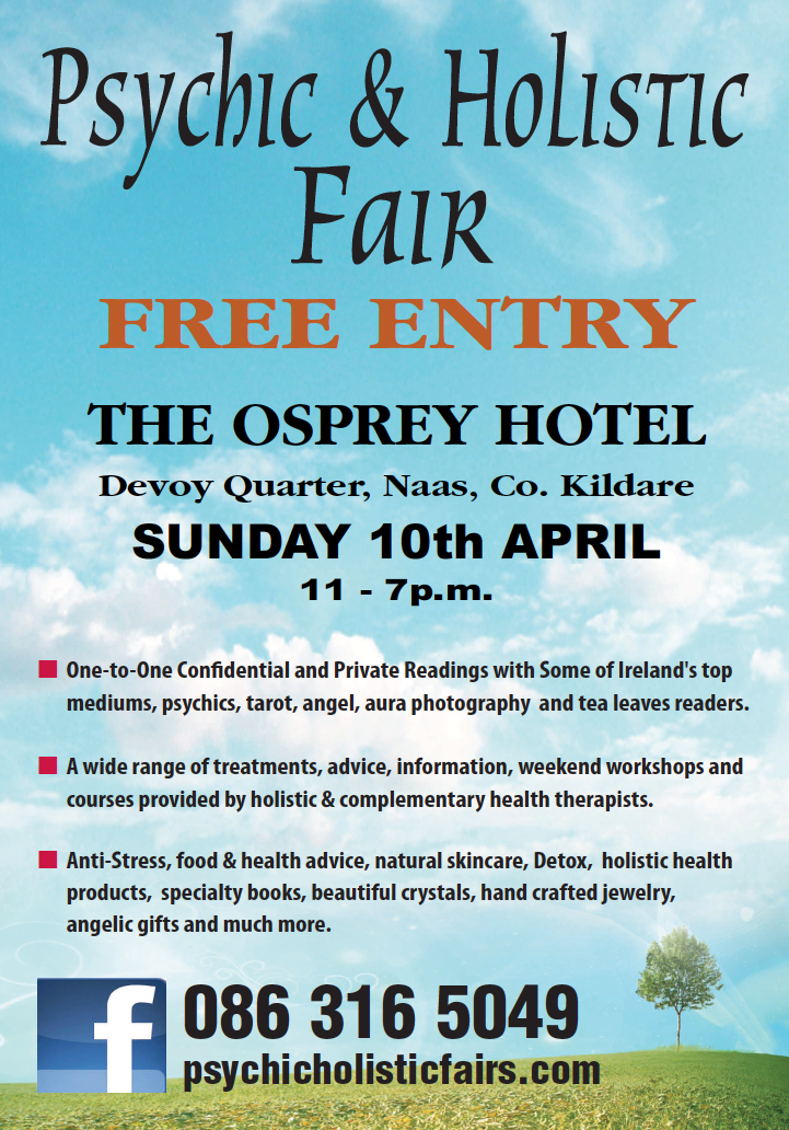 Free Entry to the Psychic & Holistic Fair at the The Osprey Hotel, Breaffy, Devoy Quarter, Naas, Co. Kildare Sunday 10th April - 11 am to 7 pm. Over 35 stands showcasing