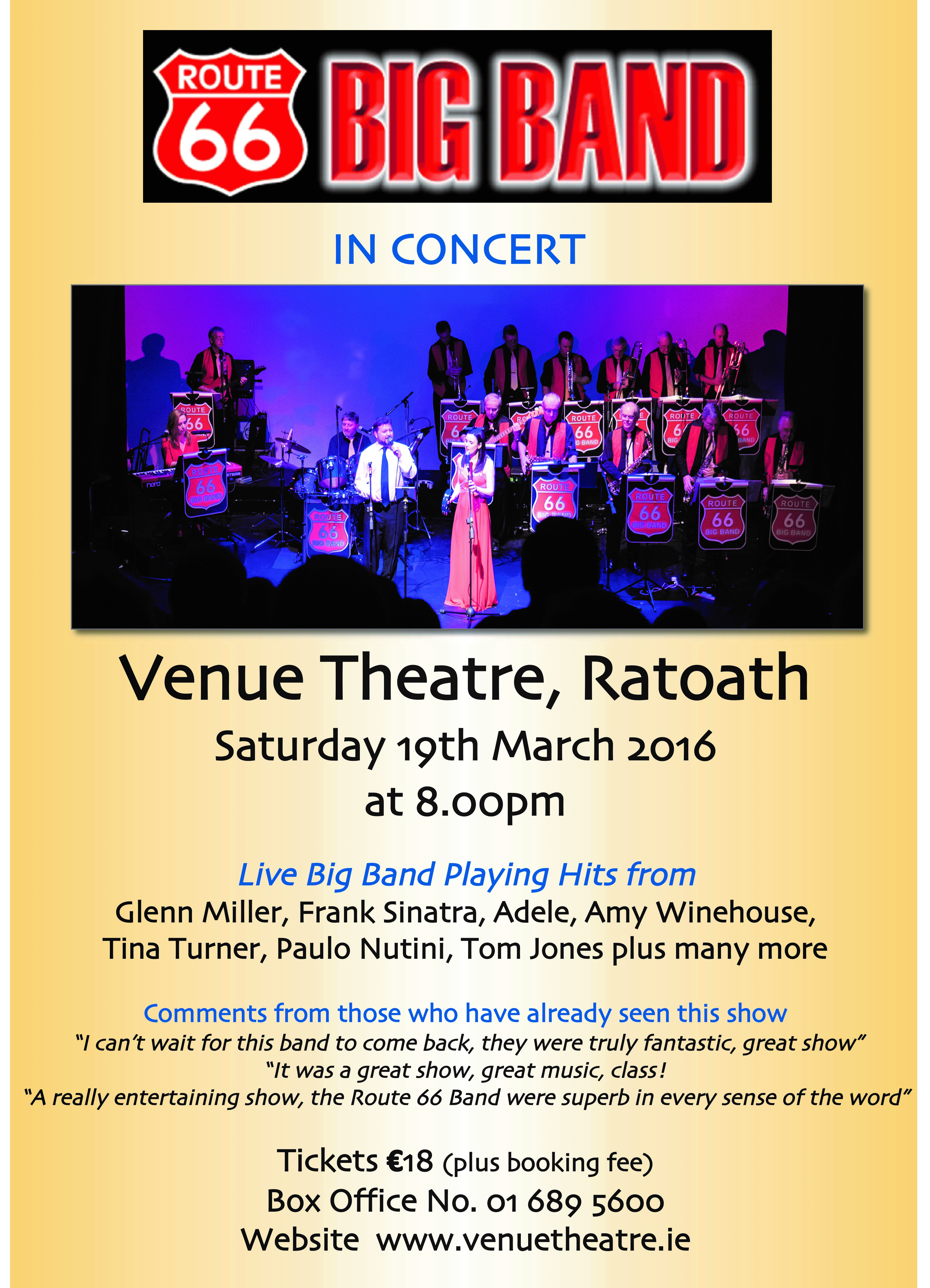 Great Show including music from the '40's to the present day with numbers made famous by Glenn Miller, Frank Sinatra, Tom Jones, Tina Turner, Adele, Amy Winehouse, Joe Dolan and Van Morrison among others all played with a big band sound.