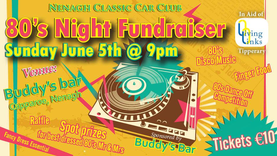Nenagh Classic Car Club presents an 80's night fundraiser in aid of Living Links Tipperary. Step back into the 80's on Sunday 5th June 2016 where you will see the best 80's disco in town. This is an 80's theamed night so we want to see people arrive in their best 80's style clothing. There will be finger food on the night, a raffle followed by a charity auction. We will have a few surprises on the night with a club members dance off so practice those moves....