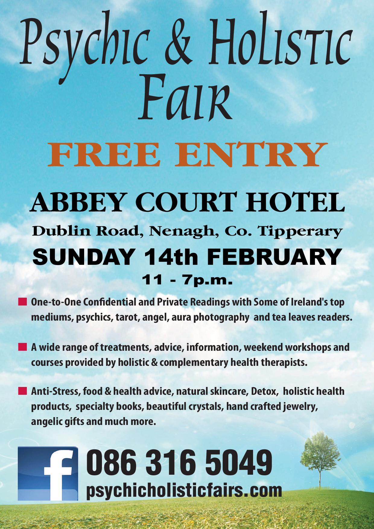 Free Entry to the Psychic & Holistic Fair at the Abbey Court Hotel, Old Dublin Road, Nenagh, Co. Tipperary the 14th Feb - 11 am to 7 pm. Over 30 stands showcasing