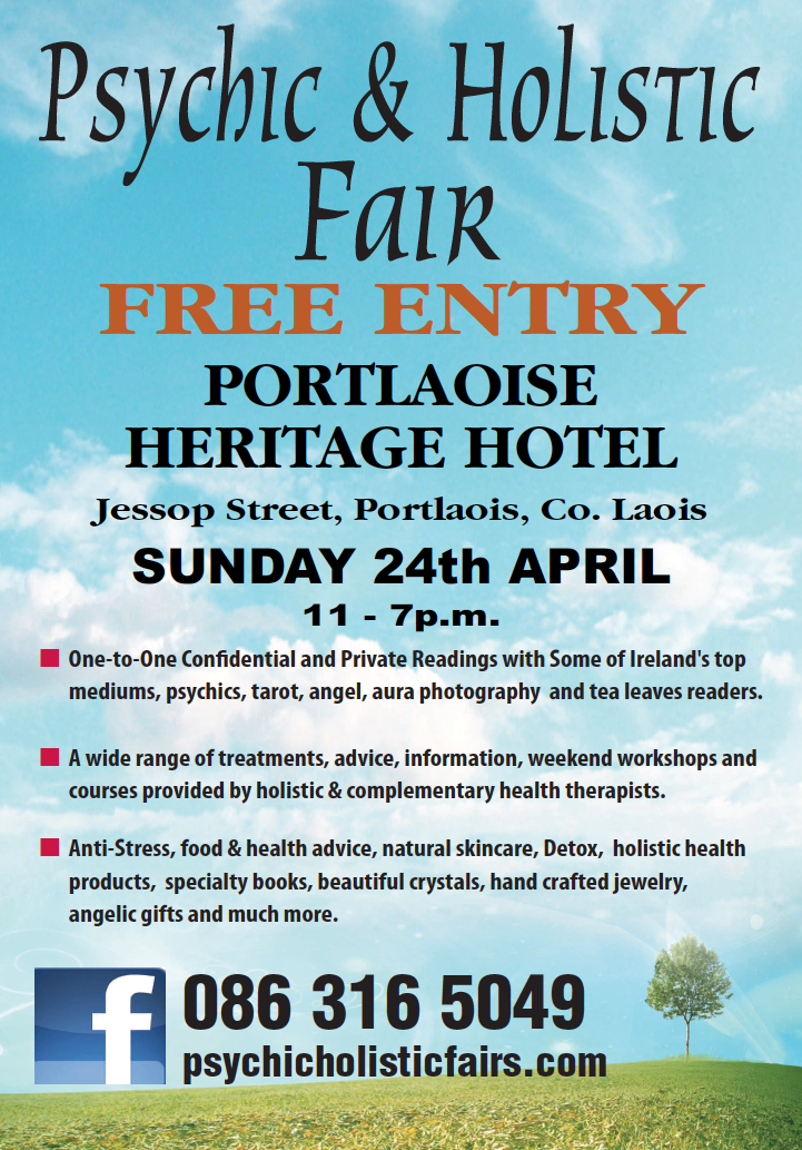 Free Entry to the Psychic & Holistic Fair at the The Portlaoise Heritage Hotel, Jessop St, Portlaoise, Co. Laois sunday 24th April - 11 am to 7 pm. Over 35 stands showcasing, free Talks & Workshops.